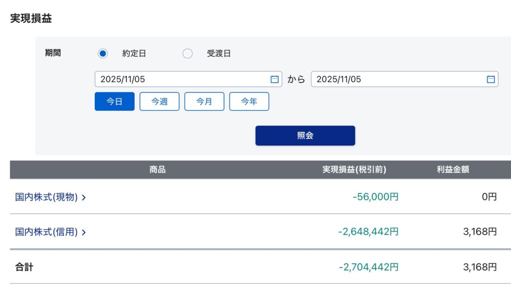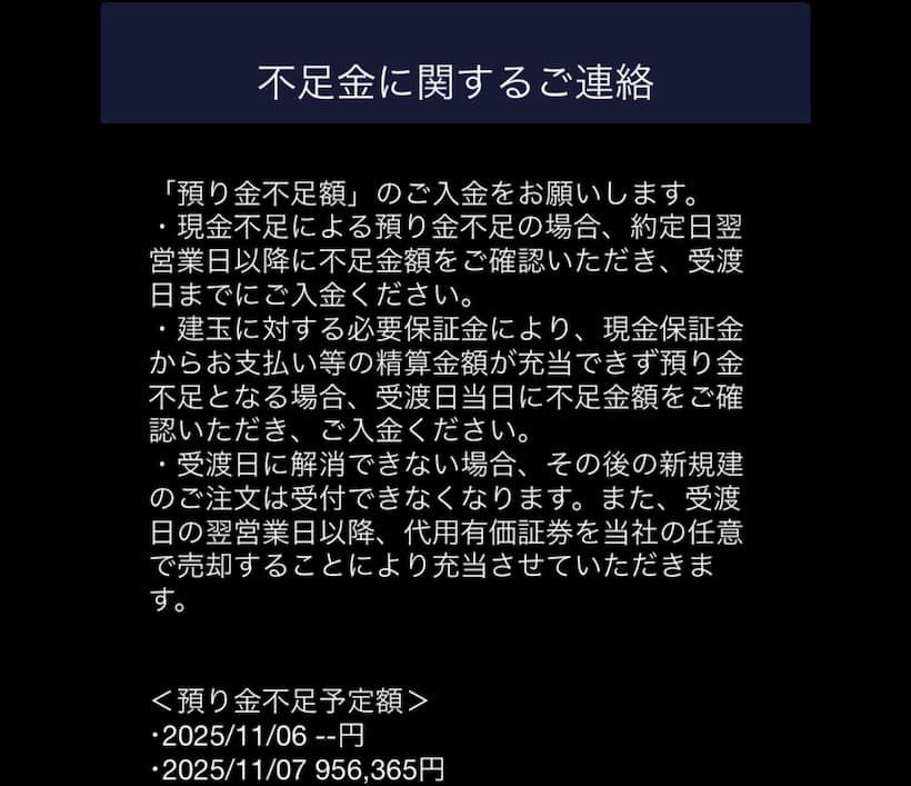 11月5日(水)のザラ場終了後。約270万円の損切り。そして更なる追証の通知。本当に終わってる。